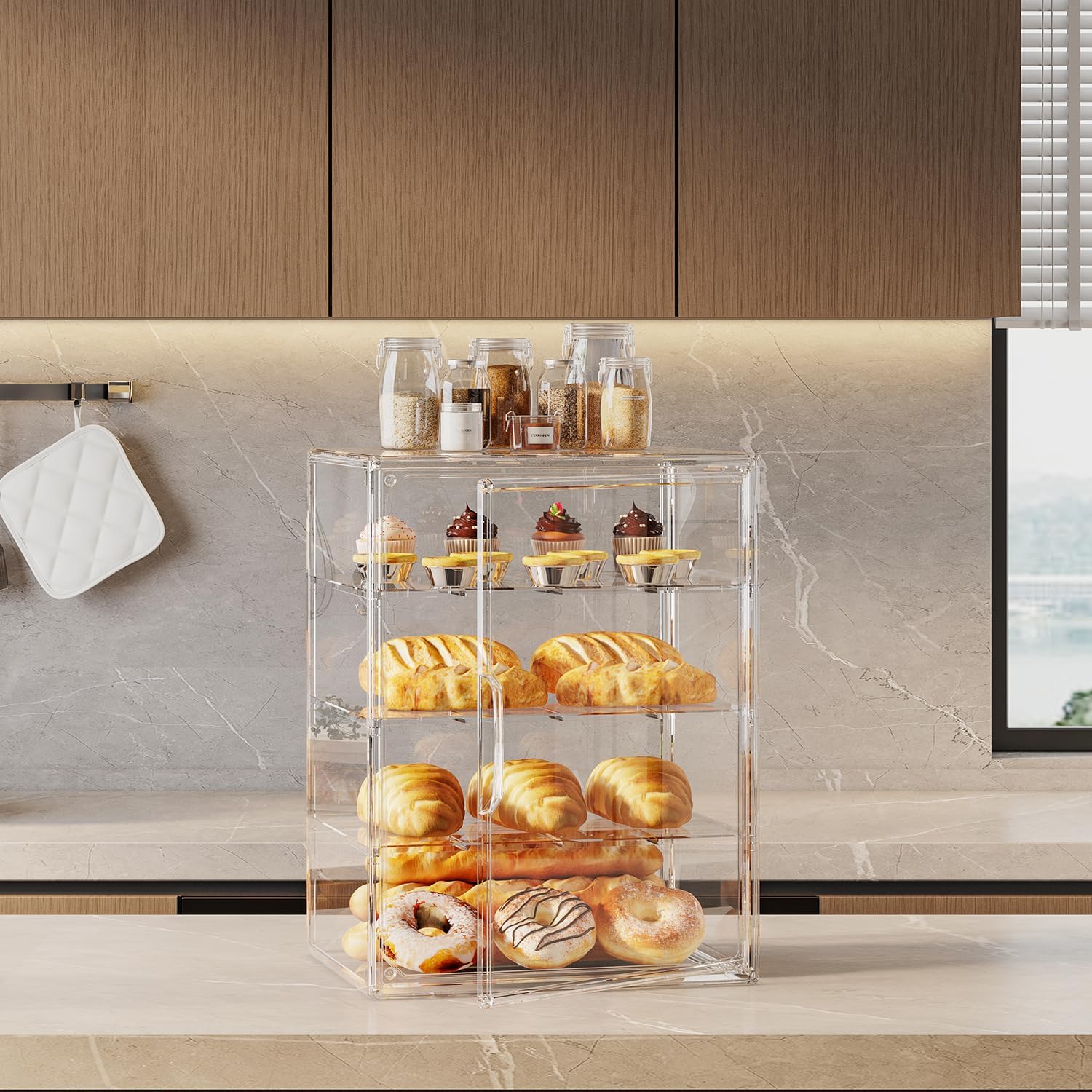 Upgrade your kitchen storage with the 4-Tier Pastry Display Case and Large Bread Box today and elevate the presentation of your baked goods to a whole new level!